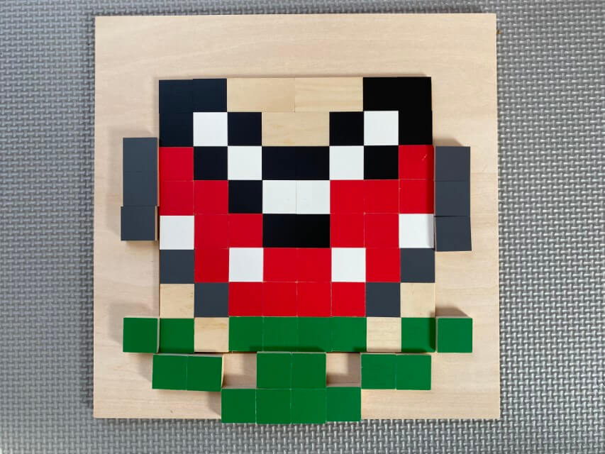 『積み木のいろは』には入っているモザイクのセットは色も原色補色でできているものなので、低年齢から楽しめます。